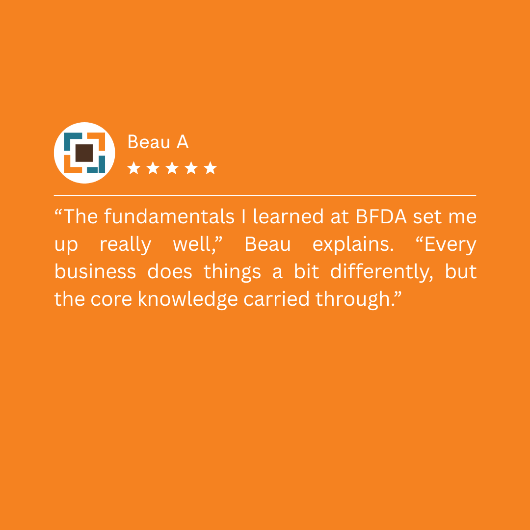 “The fundamentals I learned at BFDA set me up really well,” he explains. “Every business has its own way of doing things, but the core knowledge stays the same.”