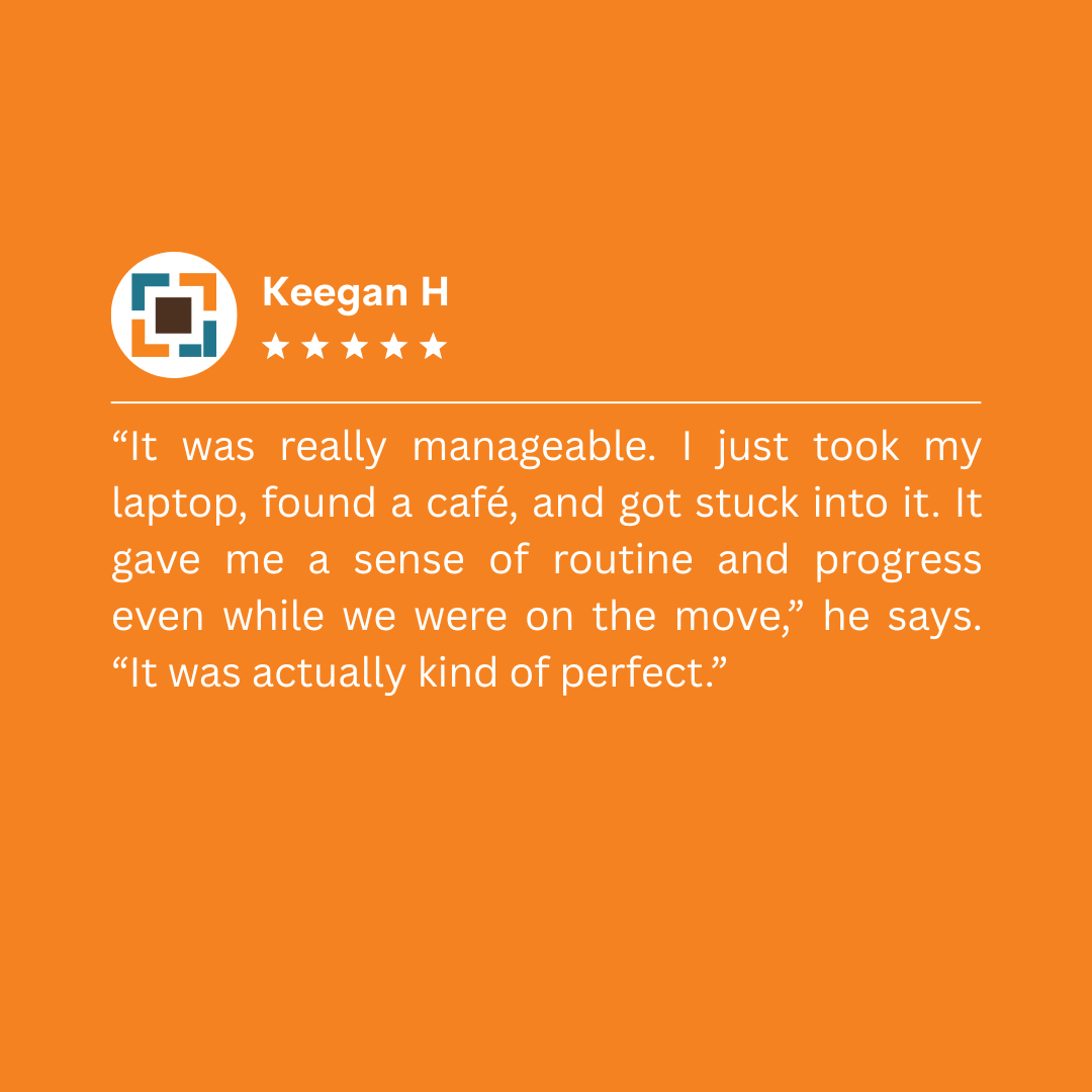 That flexibility proved critical. Halfway through his studies, Keegan and his partner moved to Toronto, then travelled through Europe. But the learning didn’t stop. Keegan made it work, studying in cafes, buses, or airport lounges, Keegan carried his studies with him—literally.
