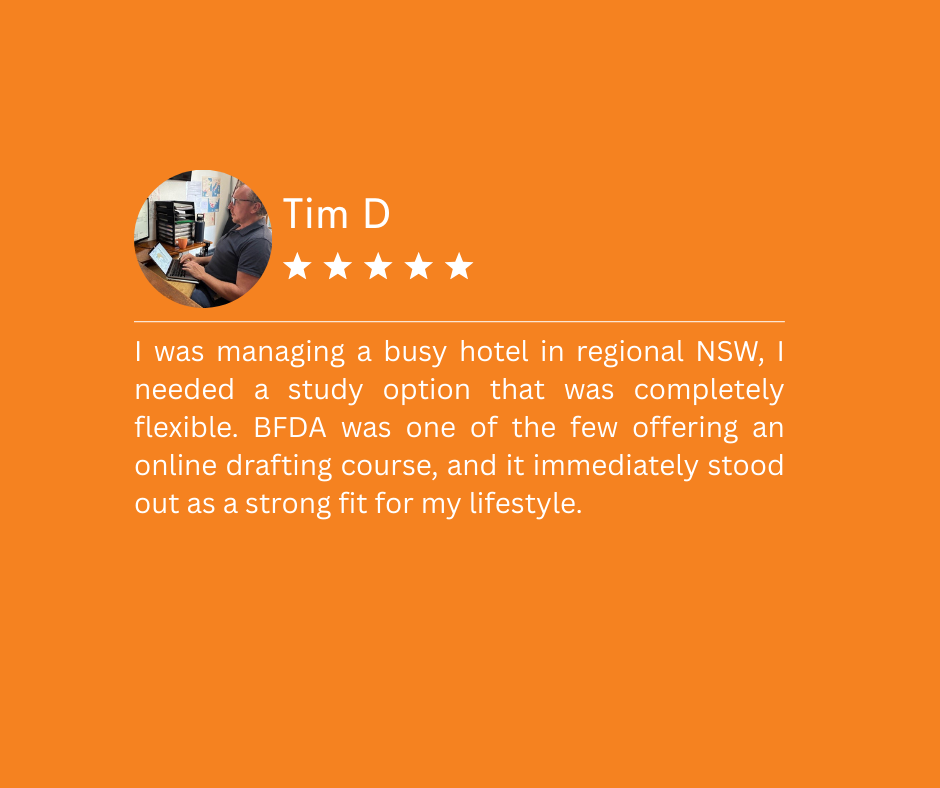 One of the main reasons Tim chose BFDA was the ability to study drafting online from regional NSW while managing a demanding job.